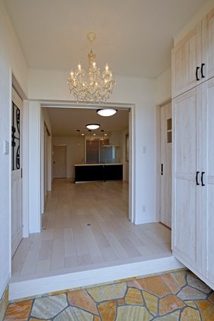 ⑦アイアン装飾の建具とシャンデリアでラグジュアリーな北玄関に