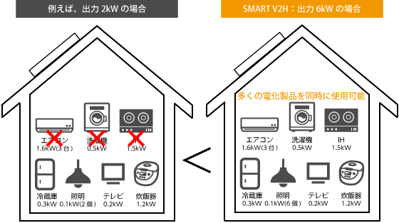 - 停電時用にあらかじめ使用する電化製品を特定しなくても、家庭内の通常コンセントでいつもと同じ電化製品が最大約6kVAまで使用できます。