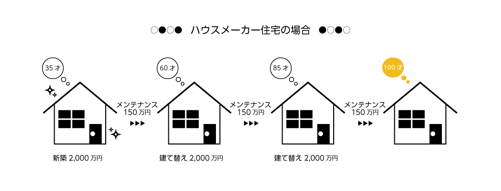 従来の日本の住宅ではローンを払い終えたと同時に建て替えが必要になり、最低でも2,000万円程度が必要になります。
