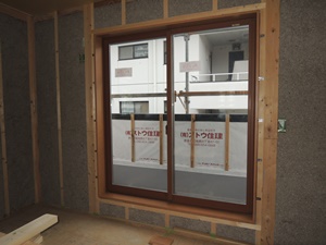 窓枠と柱・窓台・まぐさとの隙間はウレタンフォーム(発砲系断熱材)で後日断熱します。