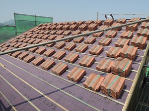 いよいよ瓦も搬入。瓦は近セラの「スーパーセラウェーブ:ボローニャ・ブラウン」です。