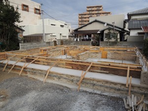 基礎のコンクリートは土間と立ち上がり部分を一体打ちにし強度を確保しております。(一般的には打継ぎが多いです。)